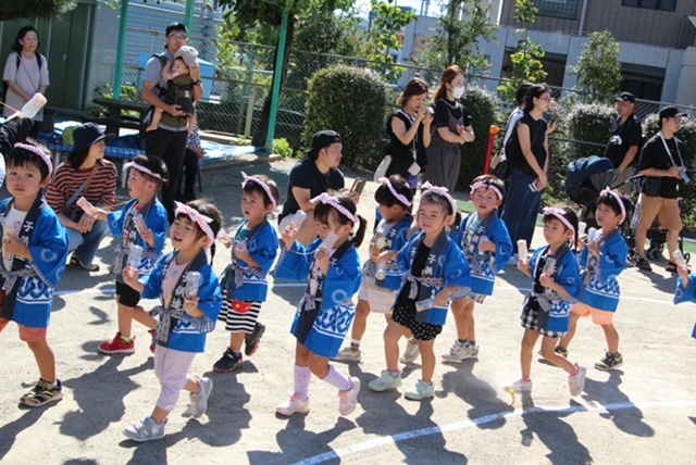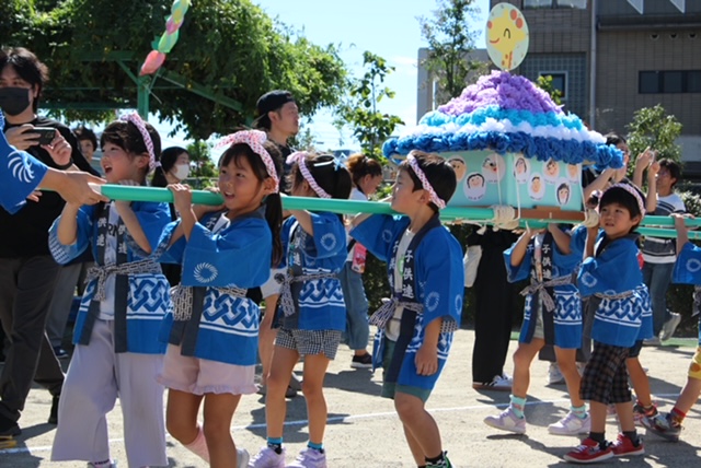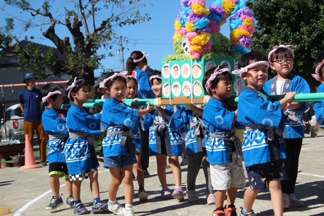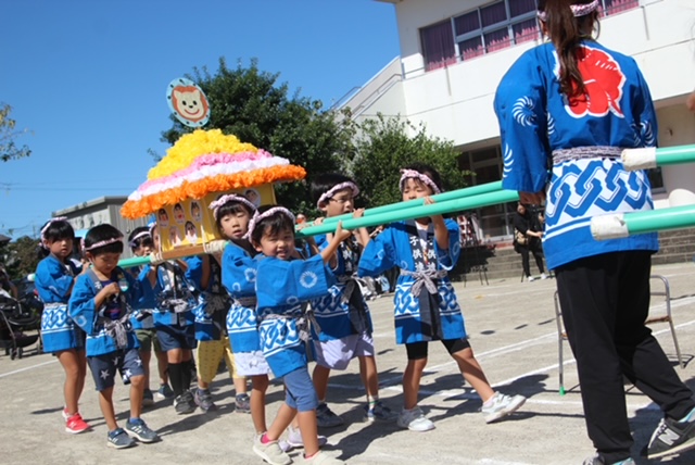 幼稚園でとれる果物や、畑でとれたサツマイモ、田んぼで刈ったお米などを奉納し、「おいしい食べ物をいっぱい実らせてくれてありがとう」という気持ちを込めて、クラスごとに作ったおみこしをかつぎながら「わっしょい、わっしよい!!」と練り歩きました。